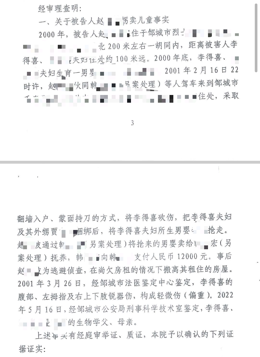 据赵某坡供述,当年他和韩某雪、郭某喜等5人到李得喜家抢了一个男婴,后联系中间人韩某营卖了1.2万元。郭某喜已于前几年去世,对于其余几名参与抢婴人员的情况,韩、赵两案判决书中未提及。