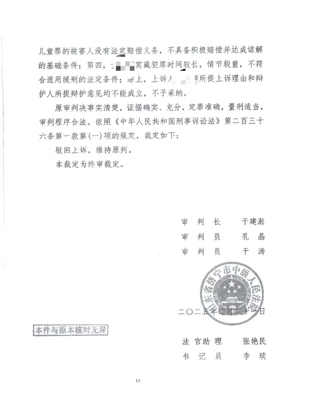 2024年10月,邹城市人民法院先对韩某雪拐卖儿童罪一案作出一审判决。法院认为,韩某雪积极参与绑架并抢走婴儿,在共同犯罪中起主要作用,系主犯,应按照其参与的全部犯罪处罚。犯罪性质恶劣,其虽自愿认罪认罚,但根据被告人的犯罪性质和所实施的犯罪行为给社会和被害人所造成的危害后果,不足以对其从宽处理。判决韩某雪犯拐卖儿童罪,判处有期徒刑15年,并处罚金6万元。2025年3月,济宁中院二审裁定维持原判。